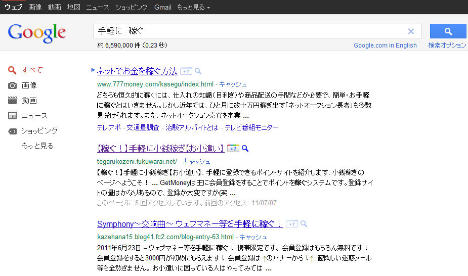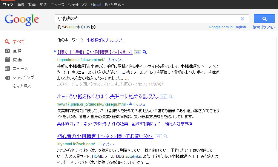 そして、本日Googleでの検索で、「小銭稼ぎ」と「手軽に 稼ぐ」の二つのワードを試してみました。